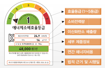 한국 에너지 공단에서는 에너지 소비 효율 등급 표시제를 운영하고 있습니다. 에너지 고효율 제품을 사용하도록 유도하여 소비자에게는 전기 요금 부담을 덜어주고, 국가적으로는 발전 설비 운